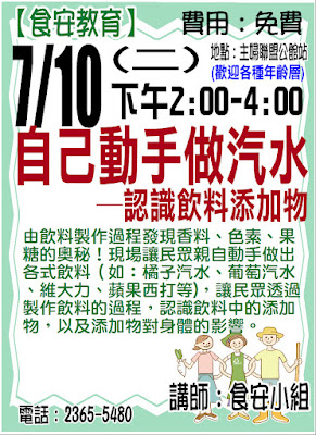 2018/07/10(二)14:00-16:00【食安教育】自己動手做汽水─認識飲料添加物 (歡迎各種年齡層)